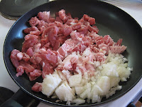 Ruskista pekoni, sipuli ja lihasuikaleet.