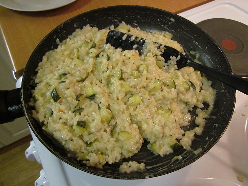 Kesäkurpitsat halusin omaan makuuni lähes mössökypsiksi, joten kesäkurpitsoja kypsensin vähän riisien kustannuksella. Risotossa riisi kuuluisi kai jättää niin, että se olisi sisältä vielä jämäkkää, mutta mun makuuni tällainen tahmeampikin versio maittaa hyvin. Lopuksi lisätty juustoraaste kyllä kieltämättä teki risotosta aika jännittävän köntsän, mutta maku oli yllättävän hyvä! :D Ottaen siis huomioon, että meillä ei vieläkään aivan kesäkurpitsan suurimpia faneja olla.